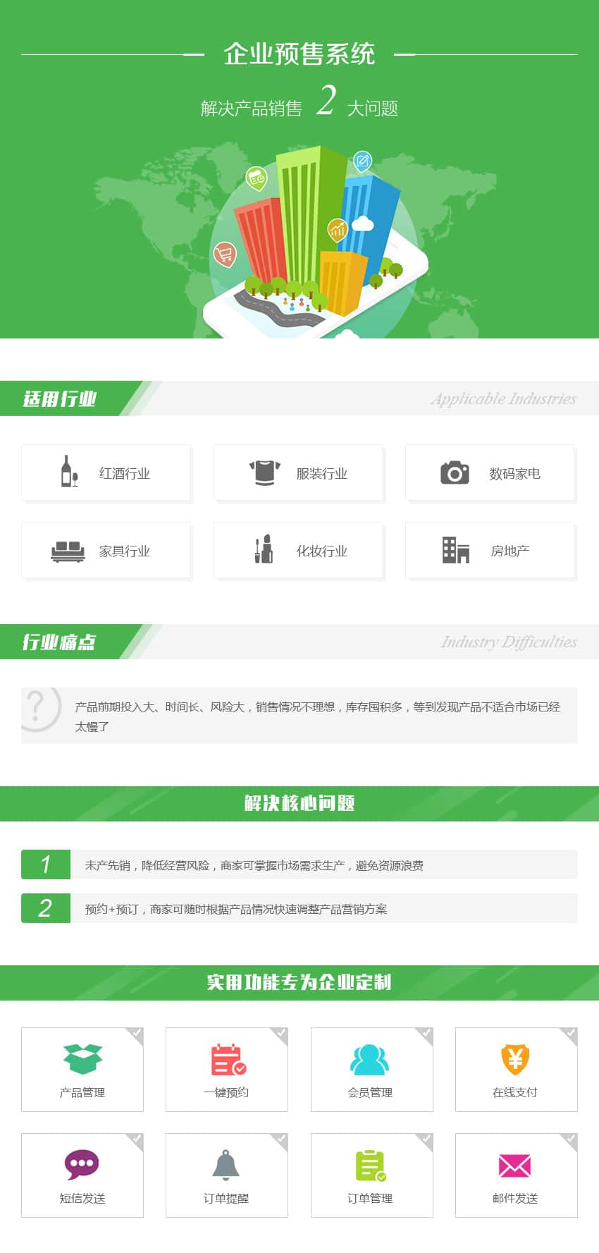 产品管理、一键预约、会员管理、在线支付、短信发送、订单提醒、订单管理、邮件发送